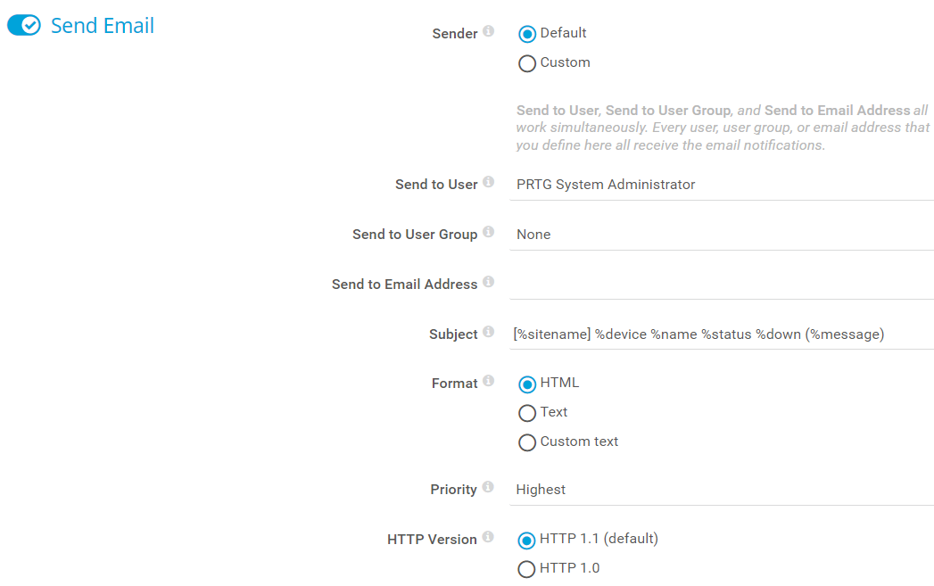 Send to User, Send to User Group, and Send to Email Address all work simultaneously. Because of this, you can define more than one user as a recipient of this notification. PRTG sends the email notifications to the active email notification contacts of the user that you select, to the active email notification contacts of all members of the user group that you select, and to all email addresses that you enter under Send to Email Address.
